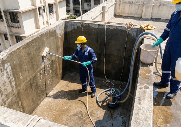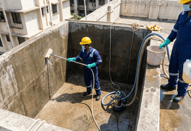 Thorough cleaning and sanitization of overhead and underground water tanks.